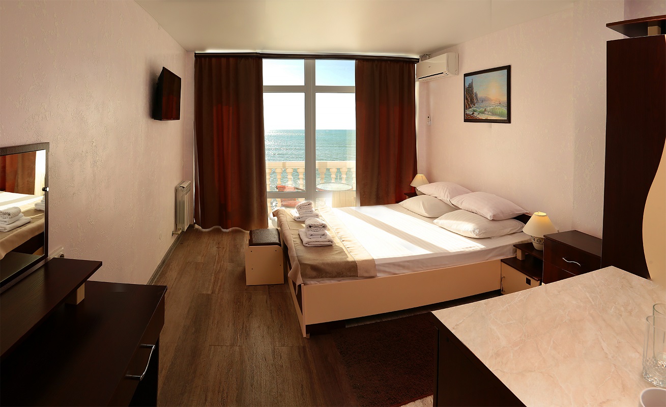 | Стандарт (вид на море) | 2 человека | 15 м² | ТВ, кондиционер, ванна, фен, холодильник, чайник, без балкона, ширина кровати 140 см |