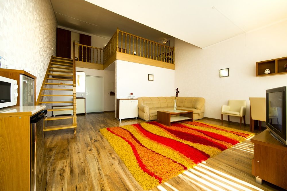 | Люкс-дуплекс (2-уровневый) | 2+2 человека | 41 м² | Wi-Fi, ТВ, кондиционер, душ, биде, фен, холодильник, чайник, СВЧ, мини-бар, сейф, гостиная + спальня, без балкона |